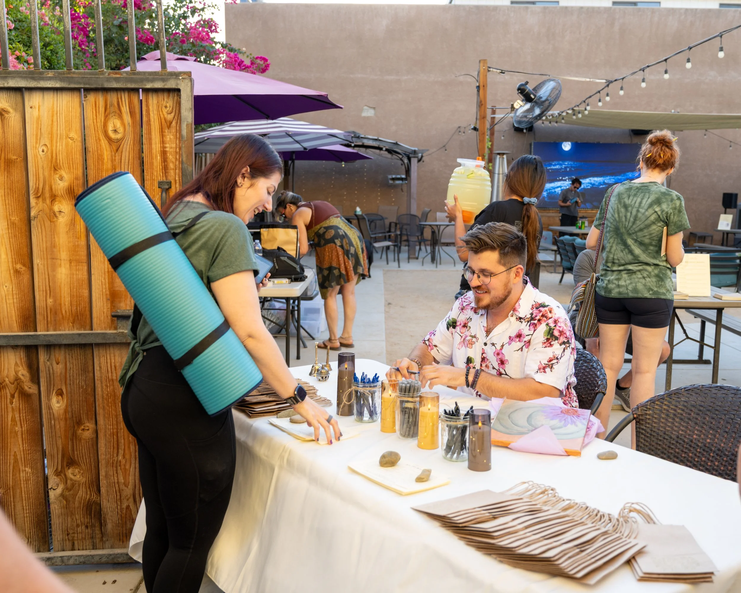 During Soul Fair, Drew moves through the space relationally, reading the room the way a navigator reads the water. When the bell sounds, he speaks from the center. During the sound bath, he is on a mat like everyone else. After The Practice, he is present. Not performing availability. Genuinely available. The deepest trust forms in the lingering.
