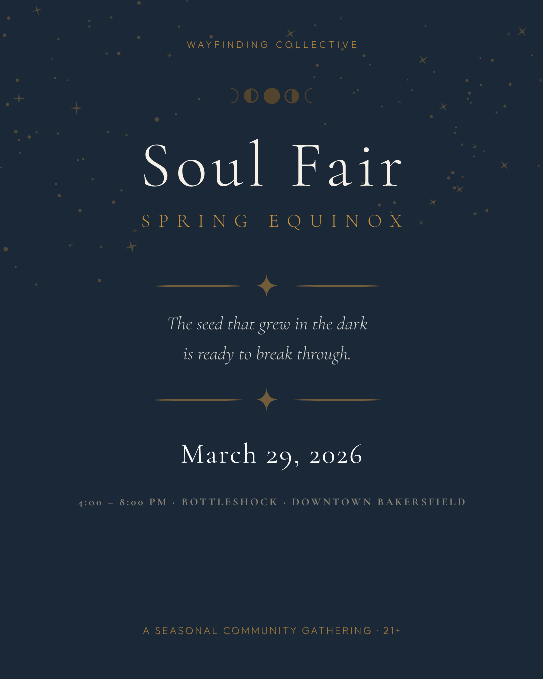 Soul Fair is the signature quarterly gathering of the Wayfinding Collective. It is the open door to the ecosystem, where people encounter the model for the first time, not through language or explanation, but through direct lived experience. Each edition is coded to the season it honors. The season is not a decoration. It is the emotional and philosophical spine of the entire evening.