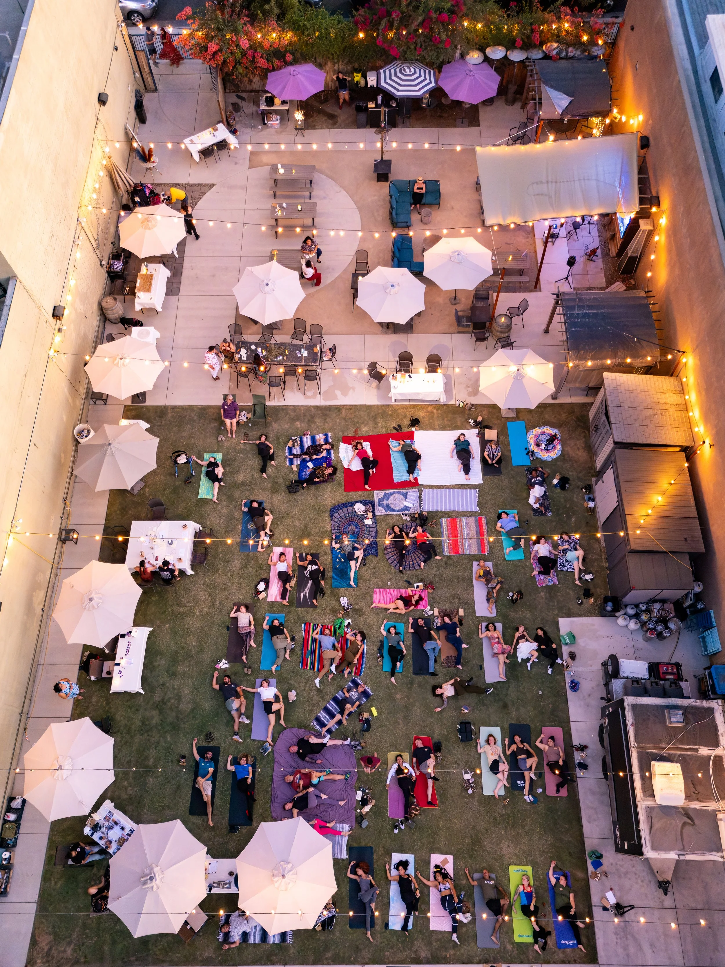 The heart of the evening. Guided grounding, collective movement, a shared gesture, and a closing sound bath. People on mats as the light shifts. Candles and string lights alive. The whole room becomes one body.